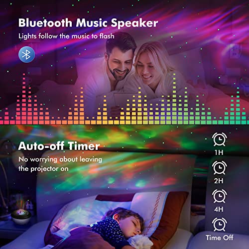 Witte ruis en Bluetooth-muziekluidspreker: Starlight-projector wordt geleverd met 5 witte ruis, 3 slaapliedjes die storende omgevingsgeluiden helpen blokkeren, zodat u of uw baby gemakkelijker en dieper in slaap valt. Of je kunt je eigen muziek afspelen met de Bluetooth verbinding, deze sky projector heeft een geluid geactiveerde functie die de lichten laat dansen met de muziek, leuk voor een feestje.