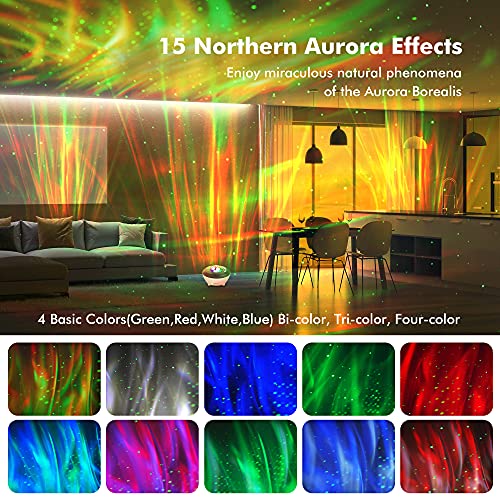 Verbazingwekkend cool Aurora-lichteffect: KIWIHOME LED-lichtprojector voor slaapkamer ondersteunt dynamische effectprojecties en 4 basiskleuren (groen, rood, wit, blauw), tweekleurig, driekleurig, vierkleurig, in totaal 15 aurorakleuren gecombineerd. met groene sterren, afzonderlijk of in combinatie te spelen. U kunt de helderheid in 3 niveaus en de snelheid in 4 niveaus aanpassen om een ​​unieke en rustige sfeer toe te voegen