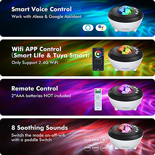 3-in-1 Starry Night Light-projector: de aurora-projector wordt gecombineerd met een bluetooth-luidspreker en een witte ruismachine wanneer u de aurora borealis-projector inschakelt, verloren in de kleur en beweging van de aurora borealis. Er zijn 3 manieren om deze sterlichtprojector voor de slaapkamer te bedienen: in Wi-Fi-modus, slimme APP-bediening of spraakluidsprekerbediening zoals Alexa en Google Assistant, in handmatige modus, afstandsbediening.
