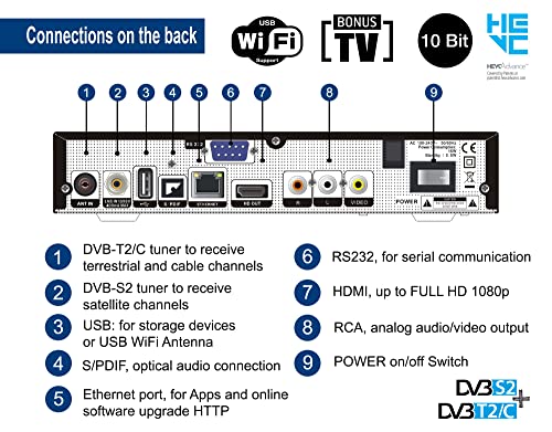 – Type: DVB-S2 en DVB-T2/C Combo digitale satellieten, terrestrische en kabelontvanger H.265/HEVC