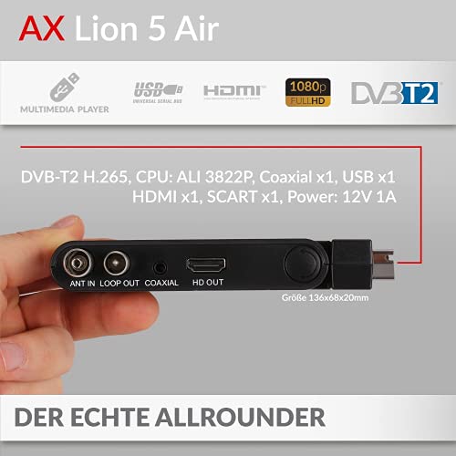 Specification: RED OPTICUM AX Lion 5 AIR DVB-T2 H.265 receiver met opnamefunctie, externe infraroodsensor met LED-display, HDMI/SCART, USB 2.0 I 12V voeding, ideaal voor kamperen