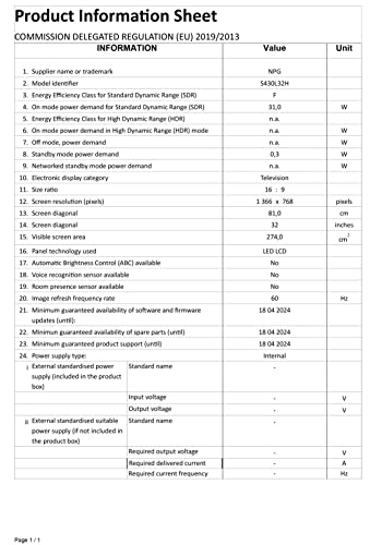 32 inch HD TV 720p NPG Smart TV Android 9.0 DVB-T2 (H.265), DVB-T HD (H.264), DVB-T SD (MPEG-2), DVB-C resolutie: 1366 × 768 HD 720p Aspect verhouding 16:9 | koelvermogen 60Hz | Contrast 40000000000 0:1 | Kijkhoek: 176H/176V | Helderheid 200cd/m²±10% | Reactietijd: 10ms Connectiviteit: Geïntegreerde WLAN 2.4G 802.11b/g/n, Ethernet-verbinding 10M/100M Aansluitingen: RJ45x1, VGAx1, AV in x1, RF 1, OPTical Out x1, HDMI x3, USB x2, PC Audio IN, mini YPbpr x1, oortelefoon x1, CI x1, stereogeluid 10Wx2